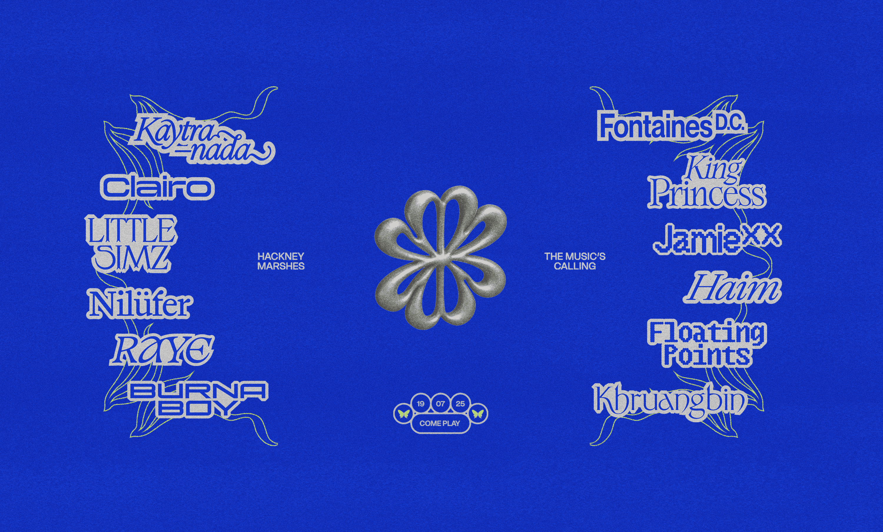 This ethos is reflected in every element of the visual system, where playful, spirited design meets a grounded urban edge. The illustrative decor draws inspiration from Art Nouveau, using flowing, organic forms to echo both nature and music's rhythm. Earthy tones mix with saturated hues, and the custom type lockups for each artist celebrate the diverse spirit of the musicians as well as the community.